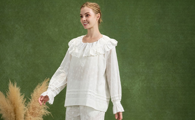 Chemisier victorien en coton à manches 3/4 ballon - Blanc cassé