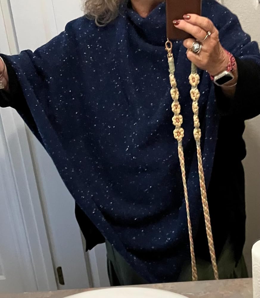 Very thick, thus warm, beautiful pull-over poncho. It's darker blue with white flecks scattered throughout and is not only fashionable but useful during cooler weather. The set opening for slipping over your head is more than adequate but still small enough for pretty high neck coverage while worn.Only high-collared shirts will be visible around the neck, if you're coordinating an undergarment. The poncho is woven so that this size opening provides a pretty drape, shoulder to shoulder, and keeps the cool breeze out while doing so!Be aware that it might be tricky to remove the poncho without disturbing your updo, if it's a complicated hairstyle, so plan accordingly. This will become a wardrobe staple that is good to go year-to-year and will always solicits compliments, I predict. Well done and worth it.
